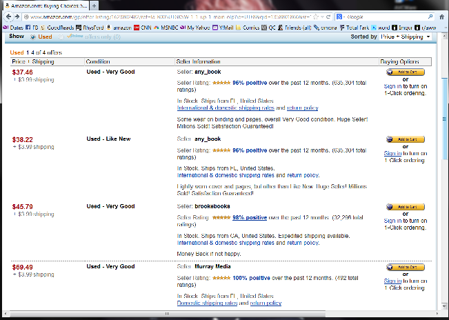 There’s been alot of speculation about these high priced used books (some are $600 – $1,200). Amazon really needs to investigate before they get pulled into a lawsuit for enabling whatever shennanigans this represents.