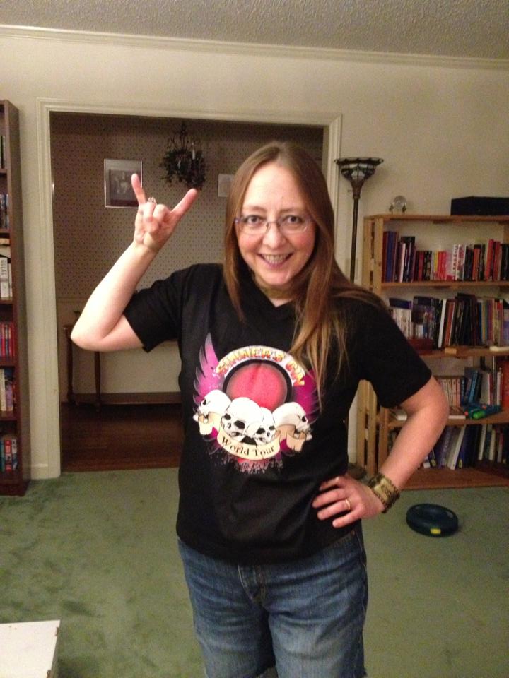 Here is Jordan L. Hawk ROCKING the Sinner’s Gin World T-Shirt in Black. Heh. Notice how clean her house is. I’m not letting her anywhere near mine.