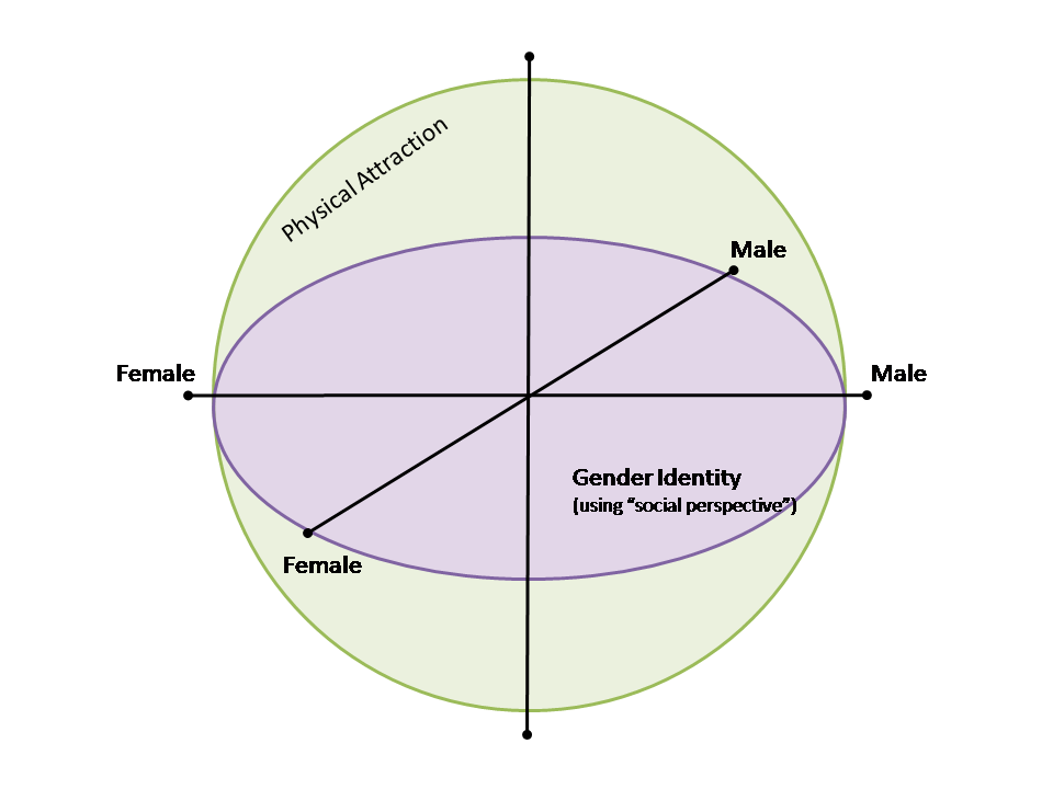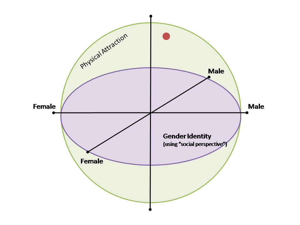 Gender Identity as perceived by society and personal physical sexual attraction currently defines us. This actually works better as a sphere with intersecting axis but like I said. I was lazy. It could have been a square… but I don’t like squares. Imagine it in three-dimensions. Trust me. It works. We’ll be good. Think arcs.