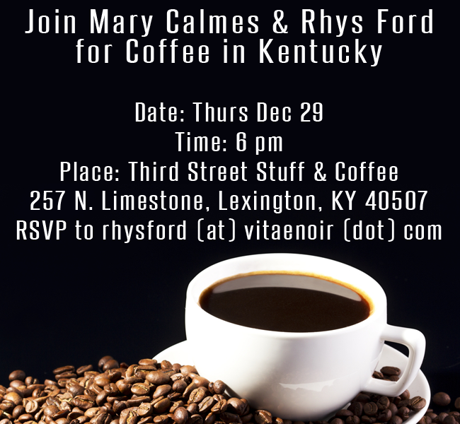 So, I’ll be in Kentucky visiting Mary Calmes for the annual Fried Rice Run. If you’d like to join us for coffee, please drop me a line. Email works best because that way I’m sure to get it. email at rhysford(at)vitaenoir(dot)com