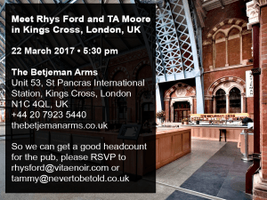 We might have another UK author joining us at the St. Pancras meet but I will need to verify. If you haven’t RSVPed for the London meet, please do so. Email me at rhysford(at)vitaenoir(dot)com. Swag will be brought.