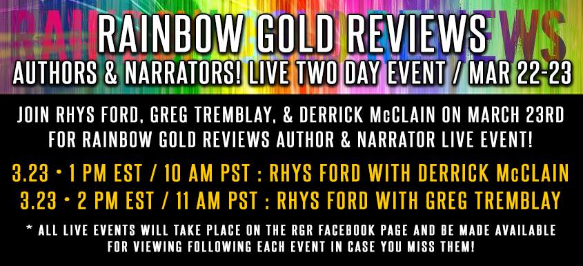 Join Rhys Ford, Greg Tremblay, & Derrick McClain on March 23rd for Rainbow Gold Reviews Author & Narrator Live Event!