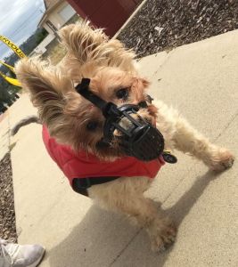 He’s had significant behavioural modification training and now lives a happy and normal life with his last out of control aggression event occuring years ago. BUT we do work to descalate those seizures from happening by diversion and minimization of stress. One of the things we are insistent on him going out with is a muzzle which serves two purposes; if he DOES have an event, no one is hurt and he feels safer with it on because he can get a little worked up and has a barrier where someone can calm him back down and he can continue to trot along.