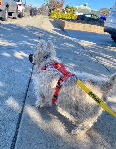 The Potato has been sharing the back yard with the Badger but the bi-weekly walks are solely for the Blond Borker. He is excited about the new harness or at least appears to be when I pull it out. So there’s that.