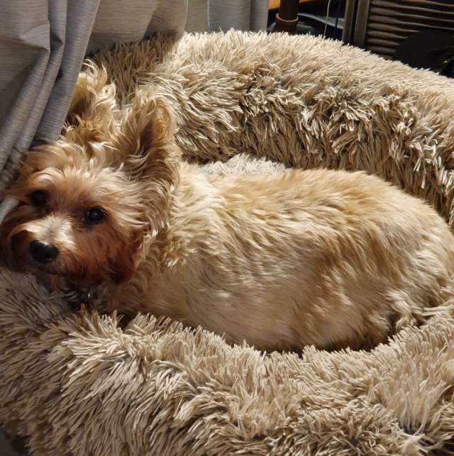 He is a thirteen year old Red Wheaten Cairn Terrier. His mother’s name was Dorothy. His father was Rooster Cogburn.