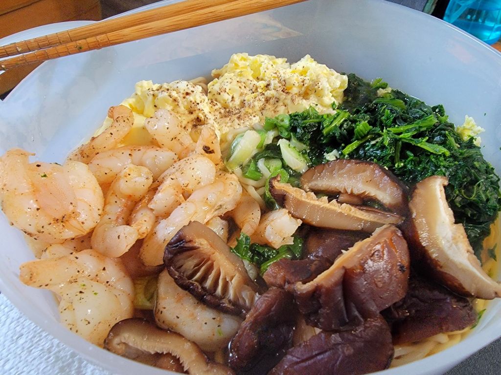 I’ve topped it with egg, shrimp, spinach, and shiitake mushrooms.