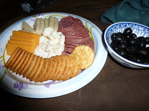 Salami, Ritz Crackers (do not judge me), pepper jack, cheddar, feta cheese and black olives.